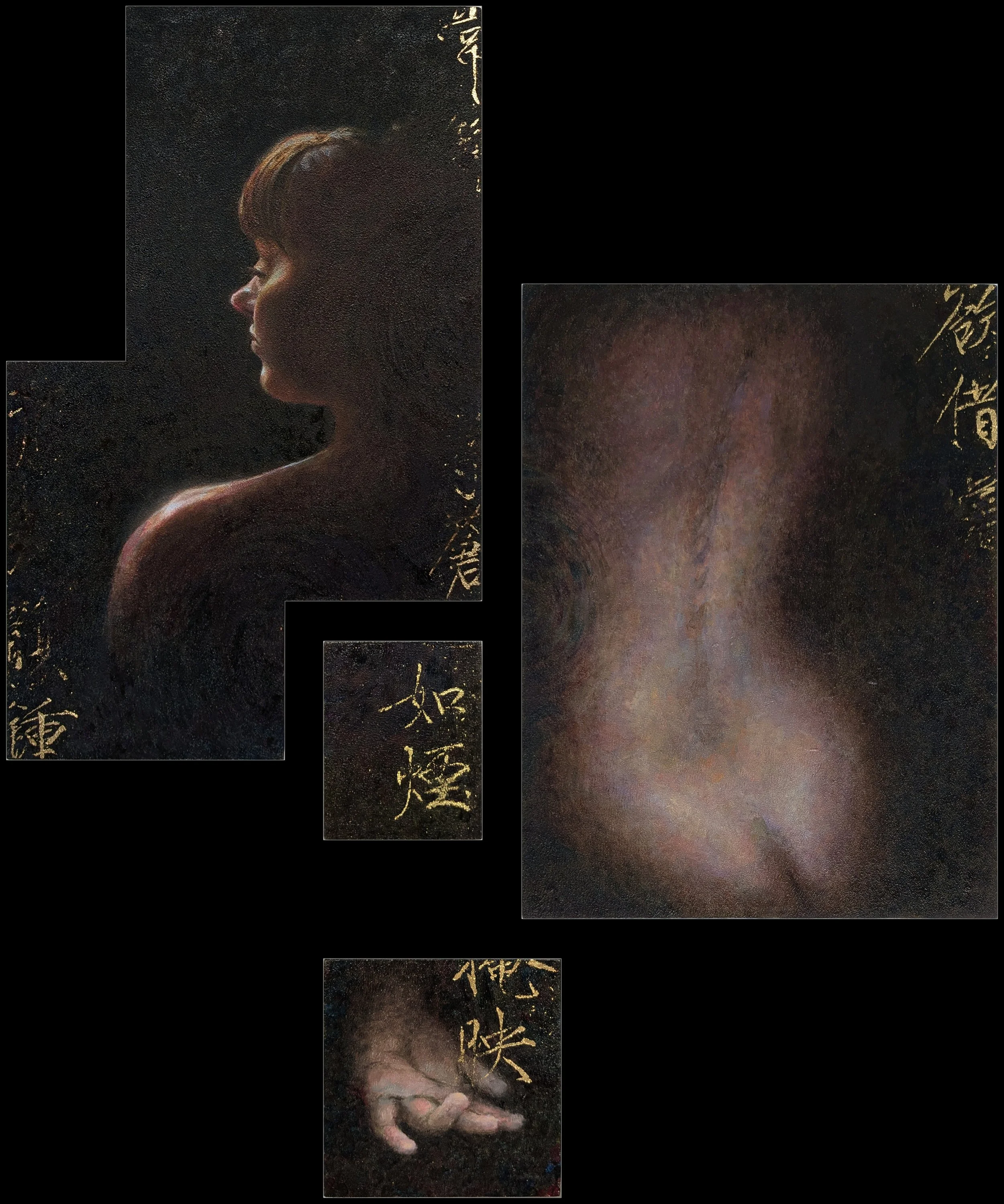 Mis-love, 41" x 41" (13" x 13" each), Oil on boards, 2024 In process
